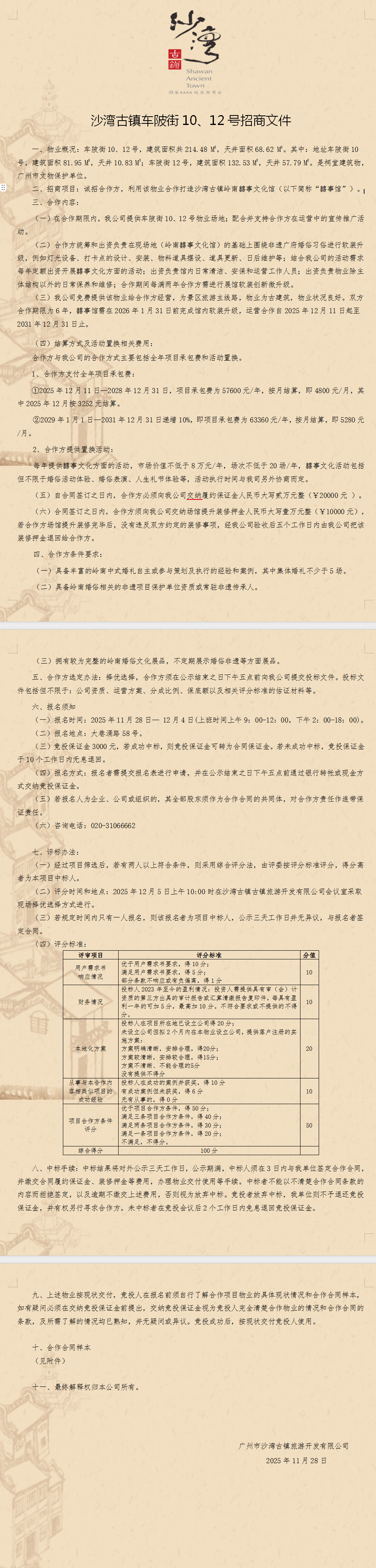 【招租公示】关于沙湾古镇车陂街10、12号的招租公示